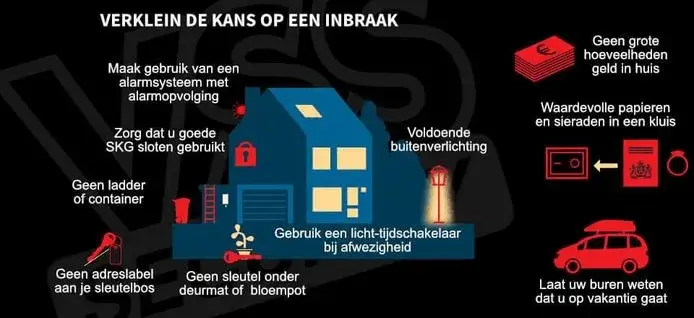 Zorg dat u ALTIJD voor u weggaat van huis ramen en deuren goed afsluit en dat u buiten geen afvalcontainers, ladders en trapjes heeft staan op plaatsen waar inbrekers makkelijk op kunnen klimmen om bij de eerste verdieping te komen (of hoger).
